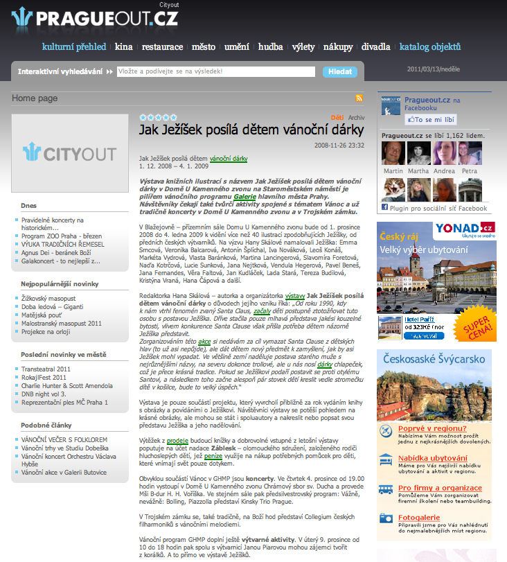 Upoutávka na výstavu "Jak Ježíšek posílá dětem vánoční dárky", kterou uspořádala redaktorka České televize paní Hana Skálová. Náhled článku se vám zobrazí po kliknutí na obrázek vlevo, celý článek na portálu pragueout.cz si můžete přečíst zde. |