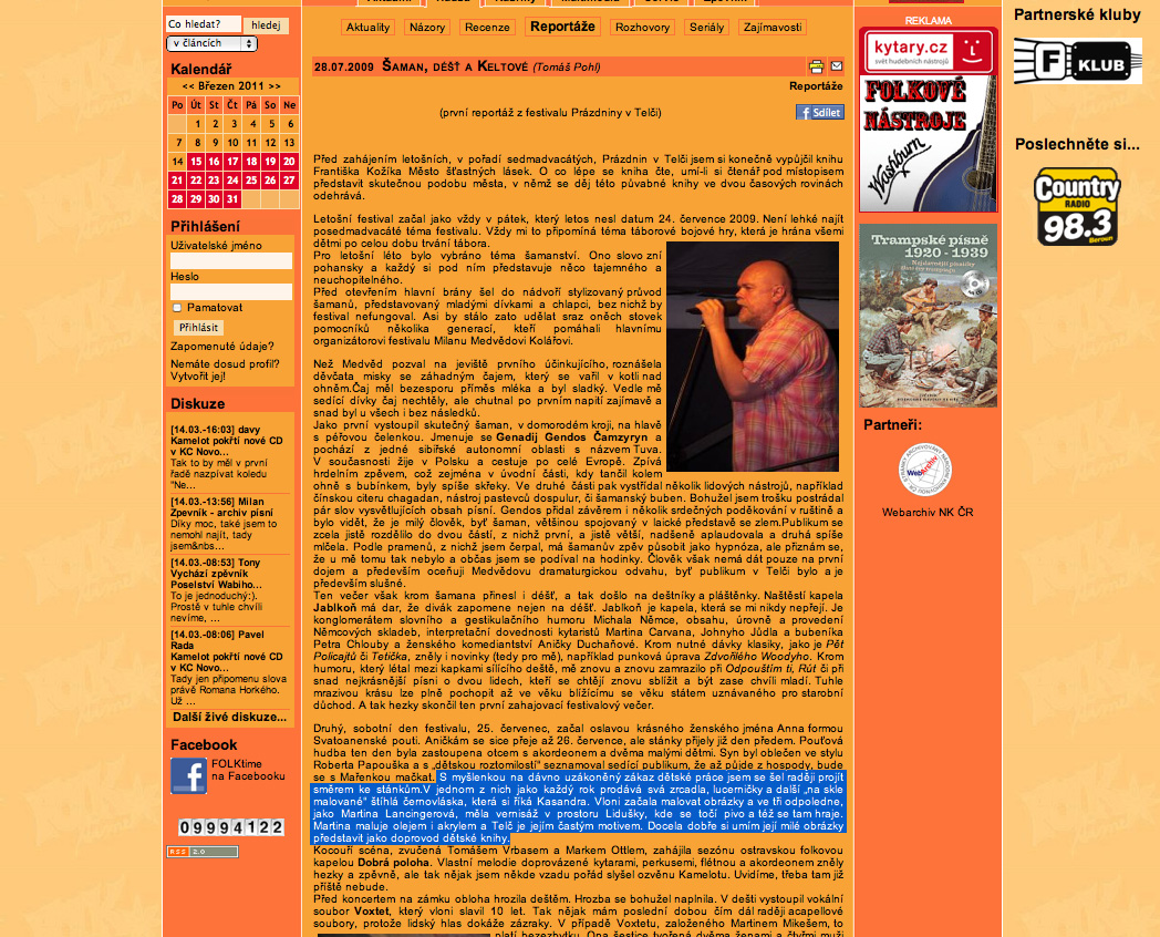 Reportáž "Šaman, déšť a Keltové" od Tomáše Pohla z Prázdnin v Telči 2009, pro portál Folktime.cz. Po kliknutí na obrázek vlevo, se vám zobrazí ukázka z článku. Celou reportáž si případně můžete prohlédnout na stránkách Folktimu zde. |